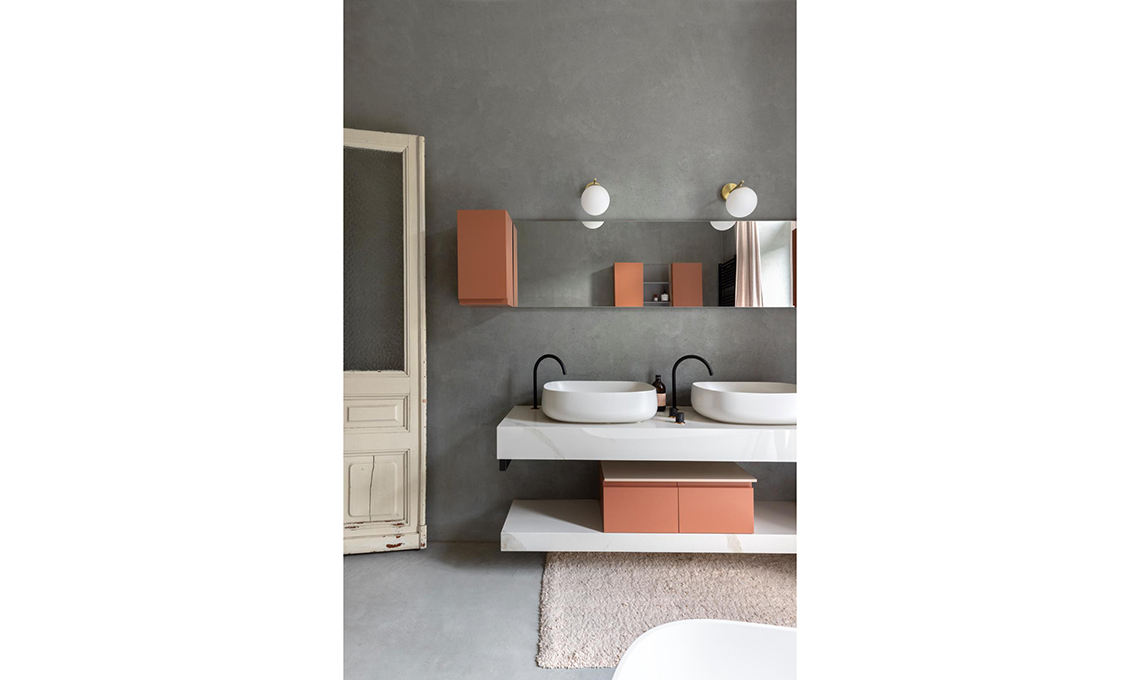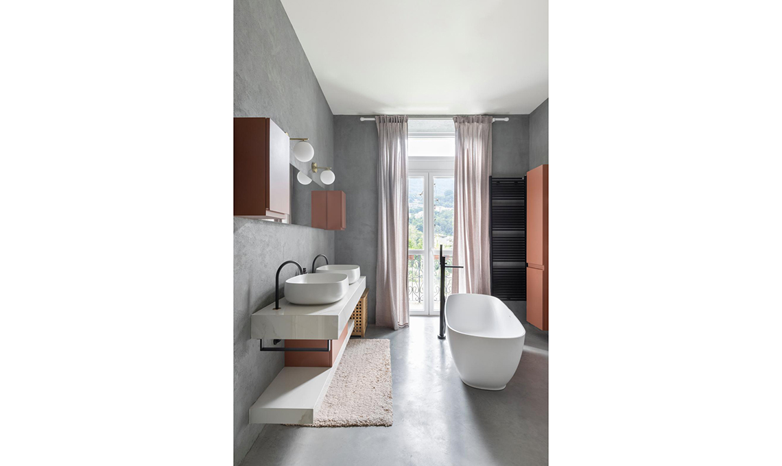 Il bagno padronale, pensato da Nora e dal marito già prima dell’intervento di Eugenia, mixa cemento industriale a spessori di vero marmo.