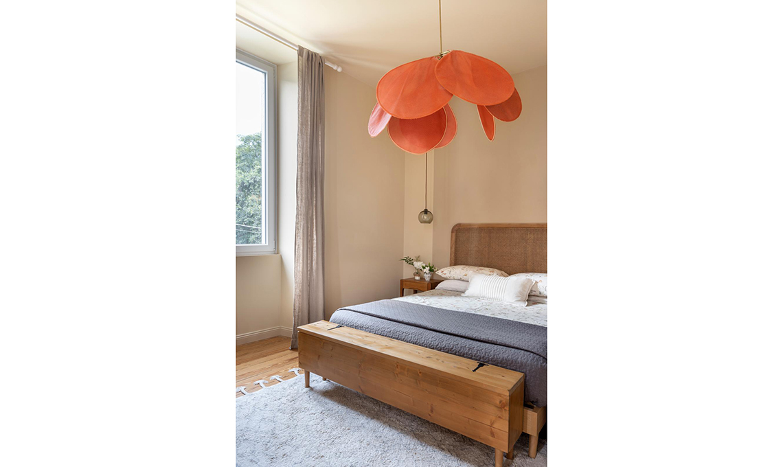 Lampadario Suspension Pale [Georges Store], testiera simile a Madara [La Redoute], comodino in rovere con cassetto [Zara Home] come la biancheria.