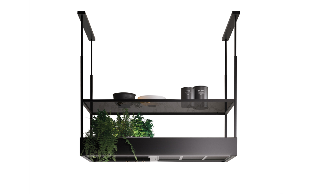 Multitasking. Spazio 130 ha una mensola in vetro fumé per stoviglie o utensili più un piano per allestire un mini orto domestico [Falmec, cm 130x60x90h min]