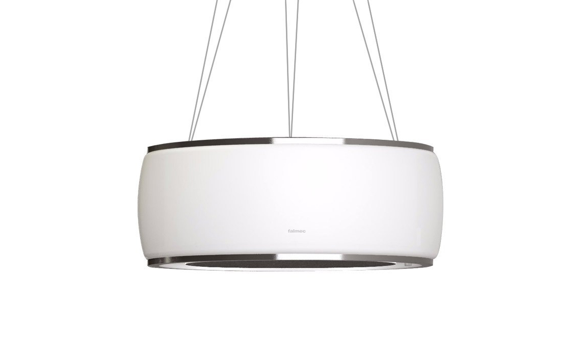 In vetro. Soffio è una cappa dotata di illuminazione led e filtro antigrasso metallico. Il vetro ha una finitura satinata che la rende bella come una lampada di design [Falmec ø cm 58x23h]