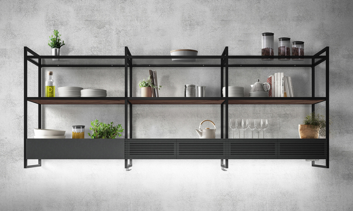 Modulare e connessa. La cappa Open Suite è dotata di moduli da 80 cm, con ripiani e luce adattabile alle proprie esigenze (per intensità e colore). Può inoltre essere connessa tramite l'app dedicata [Elica, moduli da 80 cm]