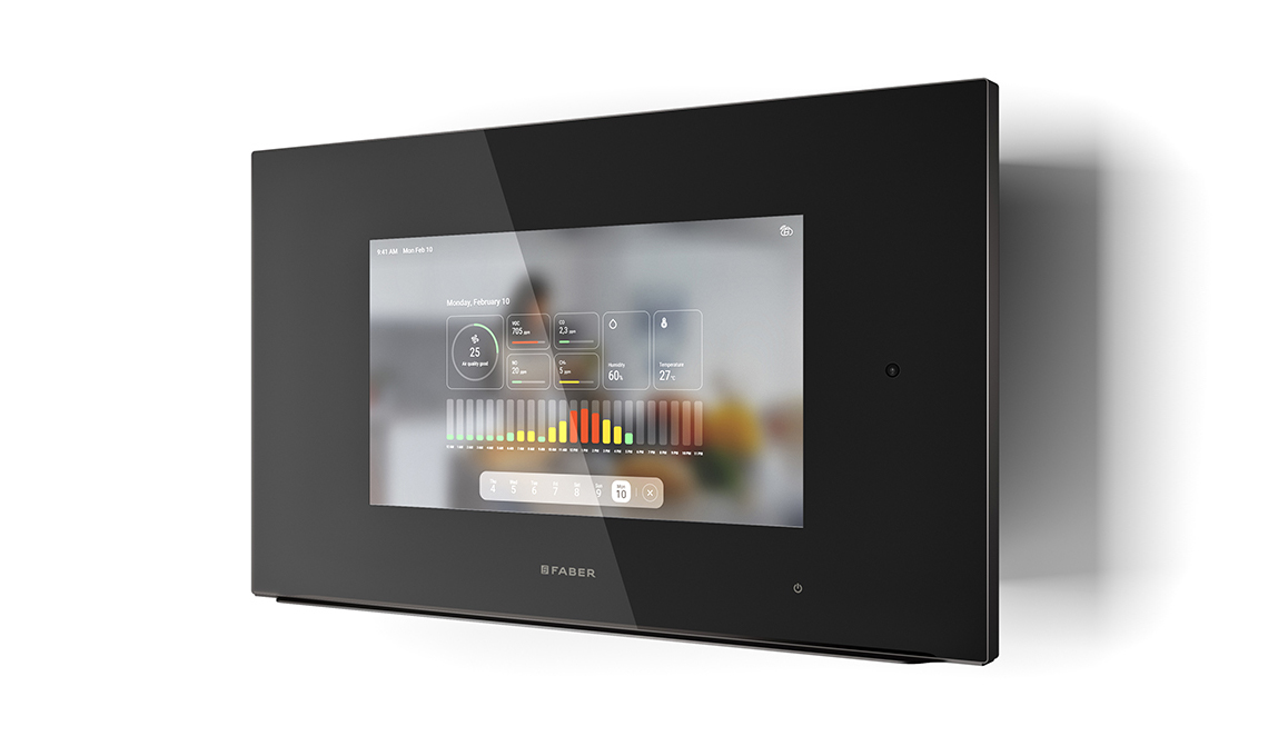 Touch. K Air è una cappa verticale a parete con monitor integrato da 21 pollici controllabile direttamente tramite touchscreen o app. Tiene sotto controllo nell'ambiente domestico la temperatura, la percentuale di umidità e la presenza di composti organici volatili (VOC e VOC), Monossido di Carbonio e Biossido di Azoto e Metano [Faber, cm 80x33x47-65h]