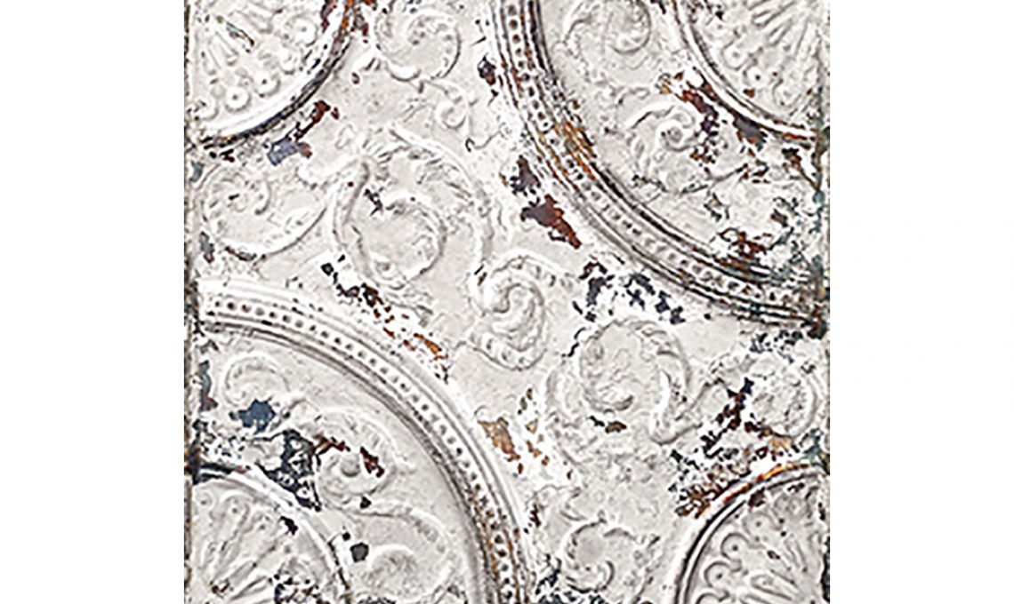 Imita le formelle vittoriane la carta da parati con effetto anticato [Koziel, cm 318x53 €74 il rotolo].