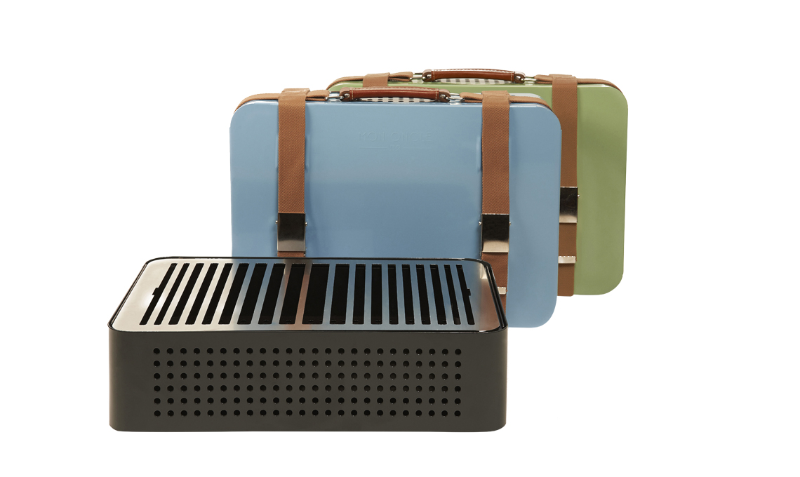 Chiuso sembra una valigia il barbecue da tavola a carbone Mon Oncle. In acciaio inox, ha manico in cuoio [RS Barcelona, cm 44x32x12h]