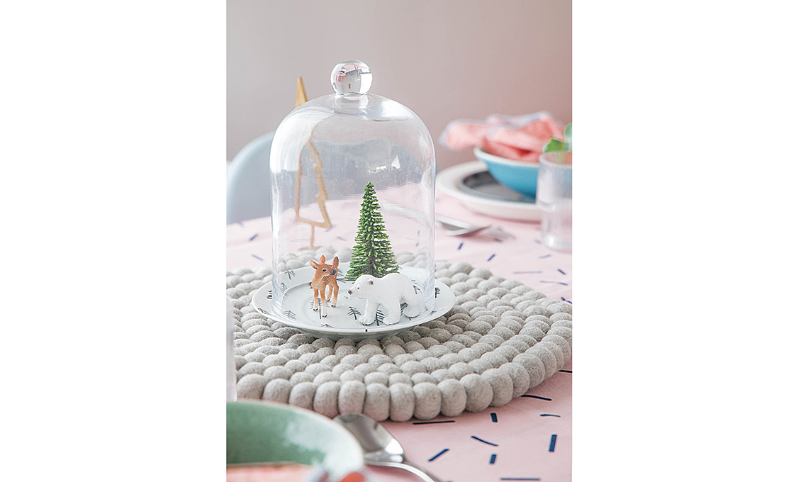 Campana di vetro, animali e alberello. Piattino con pinetti House of Rhym [su http://www.idedesign.eu ]