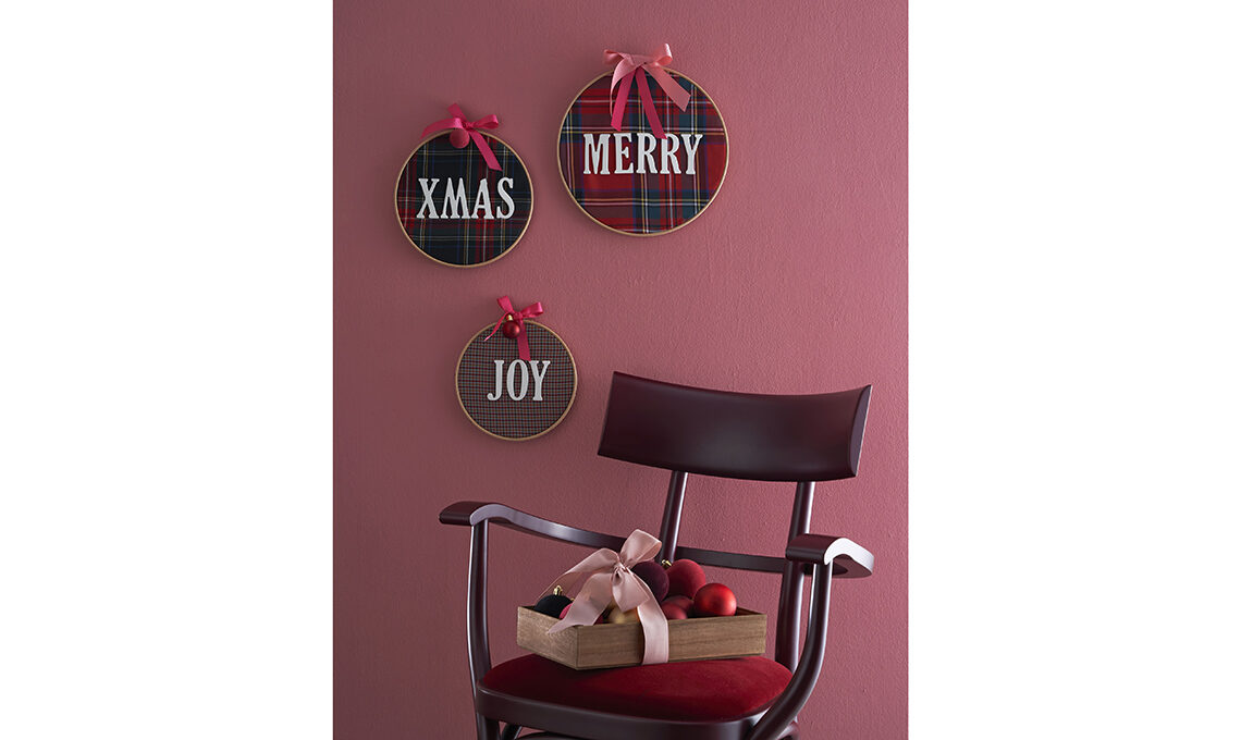 Poltroncina Czech in faggio curvato laccato wine red [Gebrüder Thonet], scatola in legno di acacia [Zara Home]. Palline decorative satinate e in velluto [Casa].