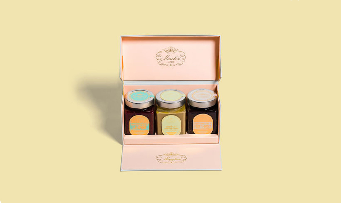 Tris di creme spalmabili e confetture extra, tra pistacchio, lamponi e frutti di bosco [Marchesi, €77].