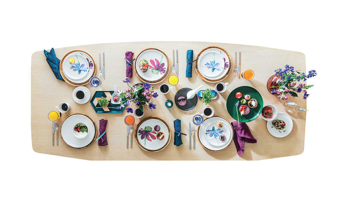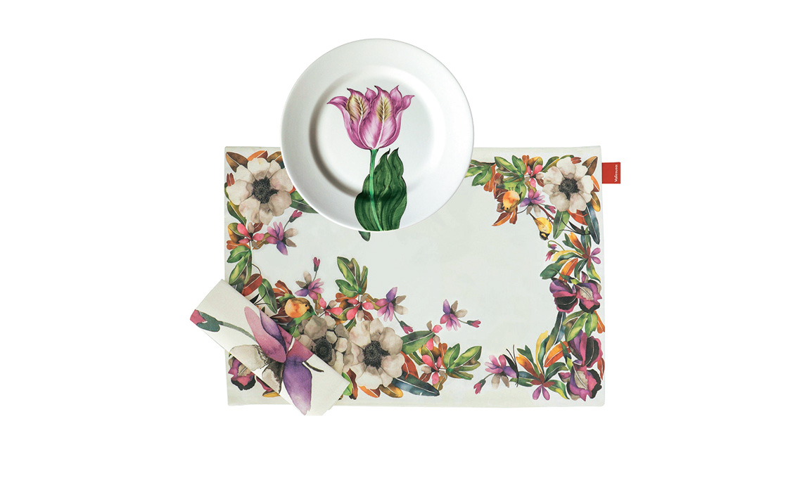 La mise en place sceglie di essere light nei tessuti e ricca nelle stoviglie: piatti coll. Artesano Flower Art in porcellana Premium, inalterabile in lavastoviglie e in microonde [da €15], piatti bianchi Artesano Original [da €17,90] e piatto verde ‘It’s my match’ [da €14,90]. Tutto di [Villeroy & Boch].