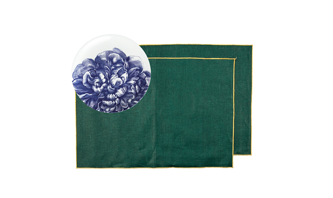 Tovagliette antimacchia coll. Filo verde bosco [Borgo delle Tovaglie €36] e piatto Peony Blue [Caskata €31].
