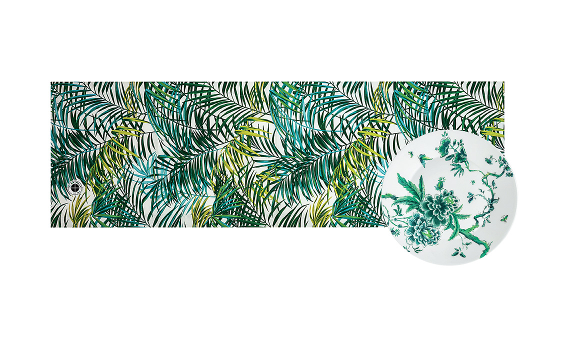 Effetto jungle tono su tono con il runner Palm Collection [Milou Milano €45] e la bone china firmata Jasper Conran [Wedgwood €39,95].