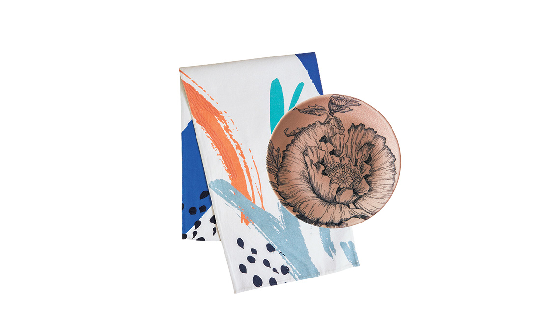 Il maxi decoro del piatto Flora Rosa [Fill €11,80] fiorisce sulle pennellate del runner Brushstrokes [Marks & Spencer €20,95].