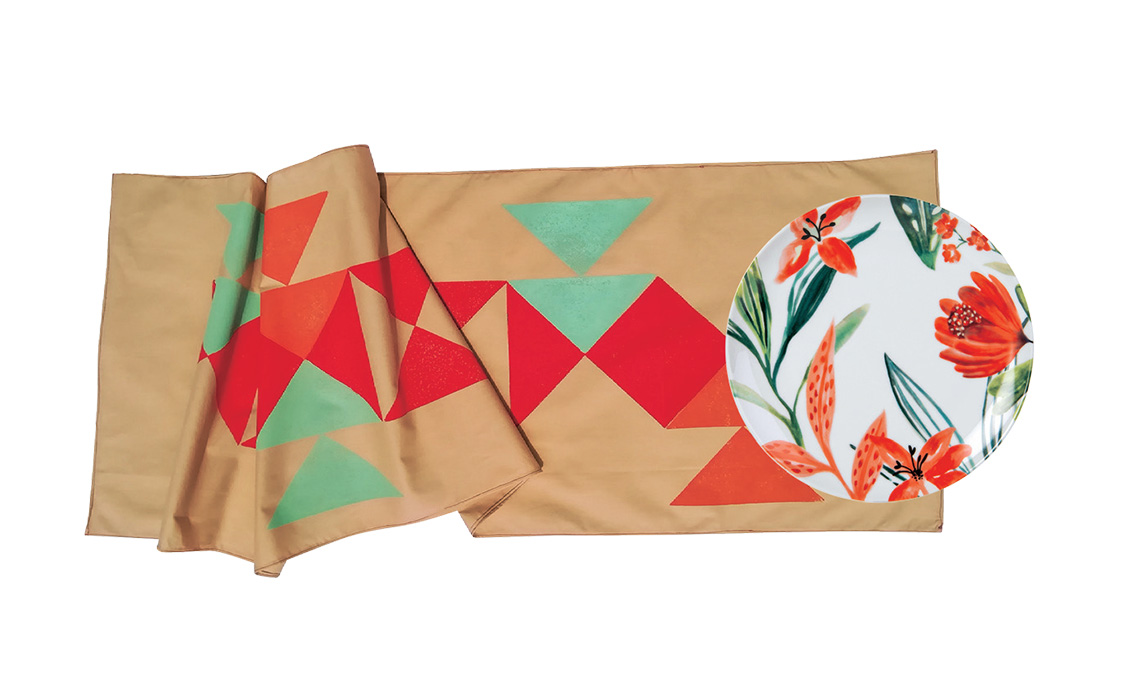 Le geometrie vanno a nozze anche con i fiori! Basta accordare i toni: runner [Tilè €40] e piatto Hibiscus [Maisons du Monde €7,98].