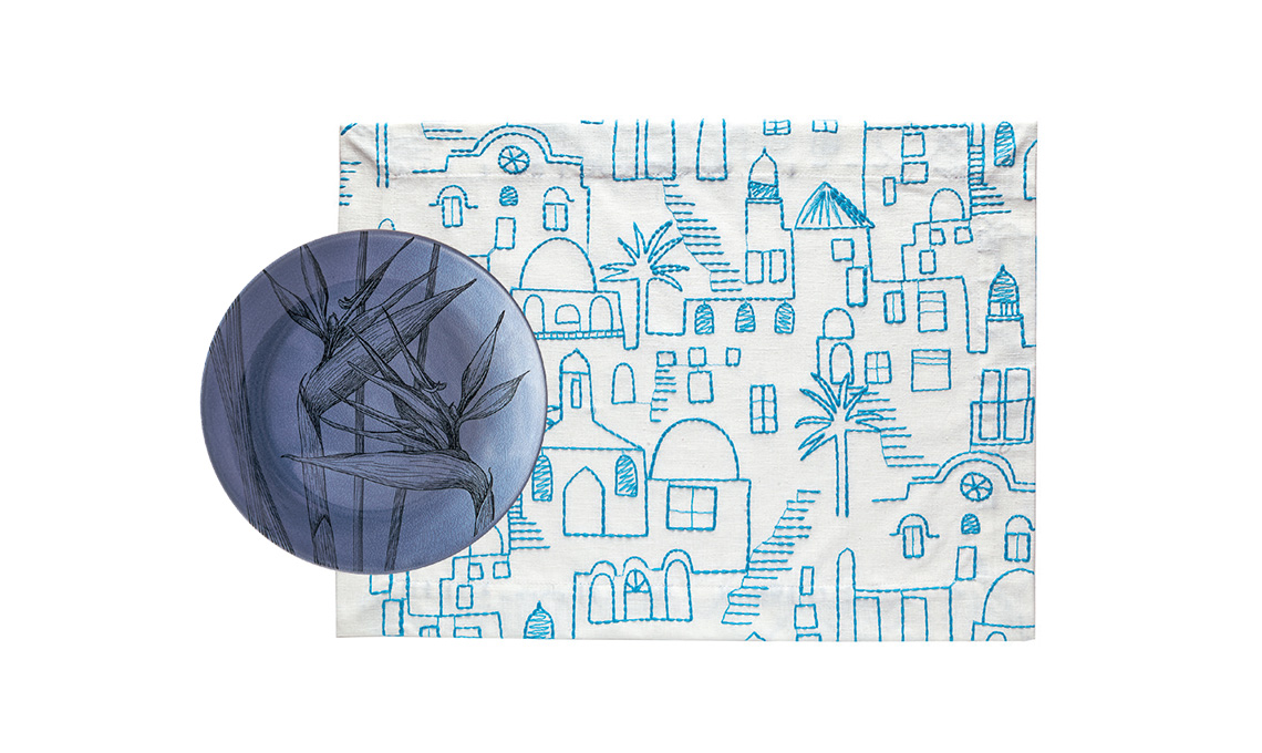 Il fascino delle isole greche nel ricamo prezioso della tovaglietta Island [Milou Milano €30]