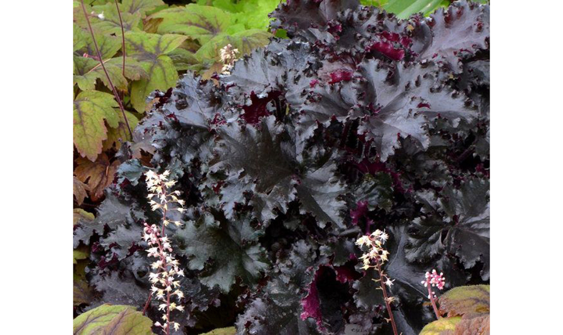 Heuchera ‘Obsidian’ per la sua tonalità è indicata per fare macchie di colore in giardino. Vuole mezz'ombra.