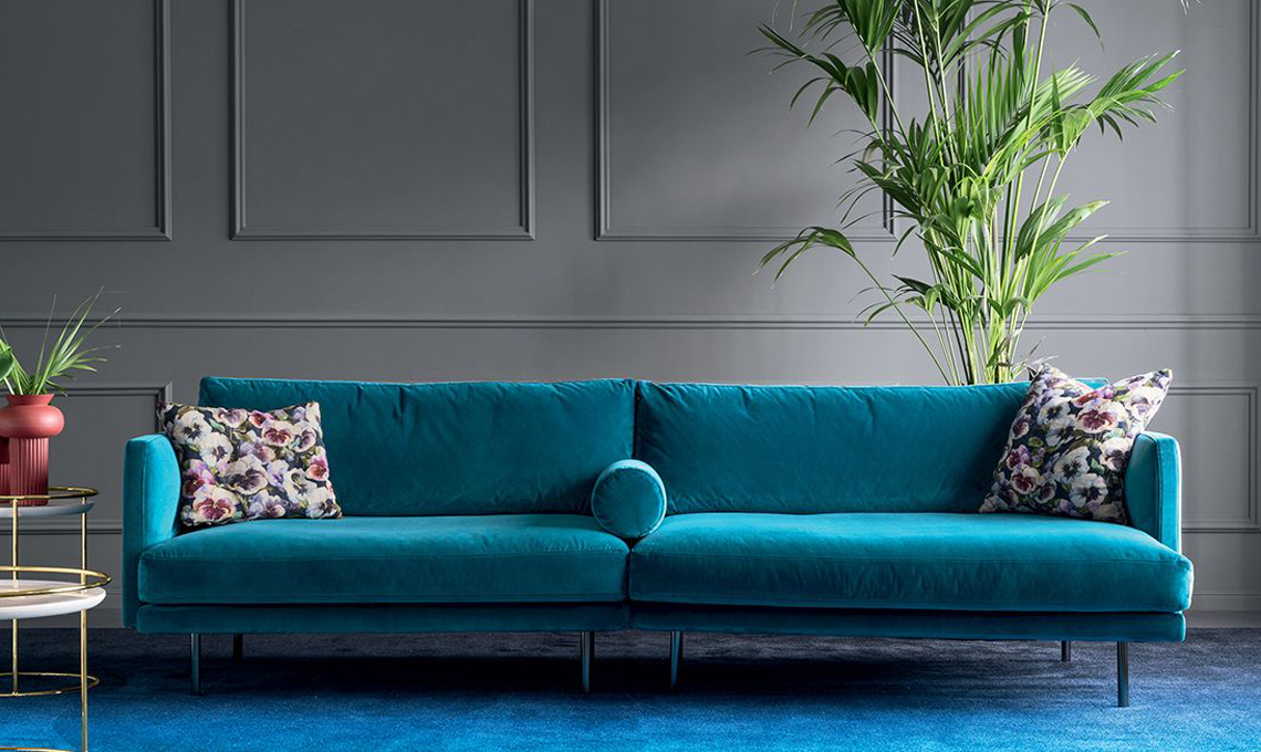 Divano letto Elvis a tre posti in velluto blu, disponibile anche in verde [Maisons du Monde, cm h84x214x87 €370].