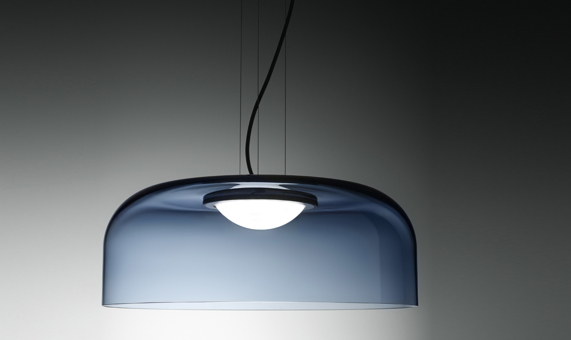 Sospensione Bell in vetro soffiato, disponibile in diversi colori [Giarnieri, cm ø51, dimmerabile €654].