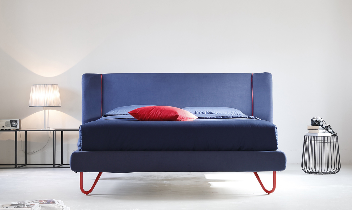 Letto Tape con testiera e giroletto imbottiti, disponibile anche in altri colori e con box sotto rete [Novamobili, cm 180,5x288x95h €2.179].