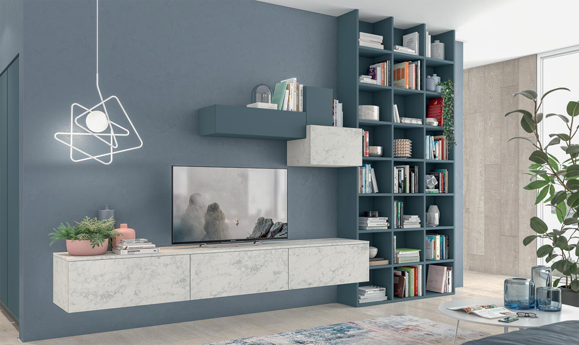 Parete attrezzata con sistema che sviluppa una vasta gamma di elementi indipendenti o integrati, a terra o sospesi, per la zona giorno [Living Lube].