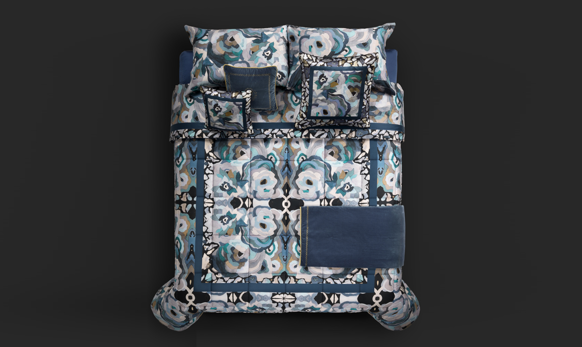 Completo letto Caleidoflora, Roberto Cavalli Home Linen, trapunta in raso stampato 300TC 100% cotone, imbottitura 300 gr. Disponibile anche come completo letto e completo copripiumino [Mirabello Carrara, da €485].