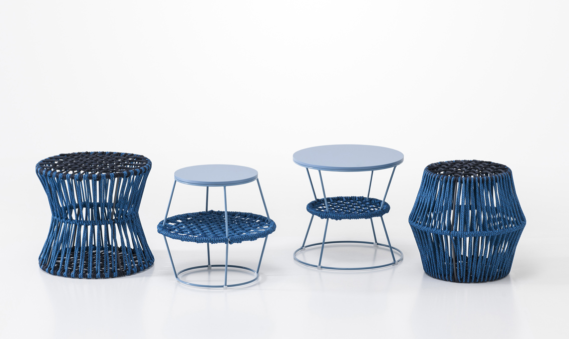 Tavolini Ziggy in tondino di ferro e intreccio di cime in Poliestere HT, possibilità illimitata di personalizzazione [Saba].