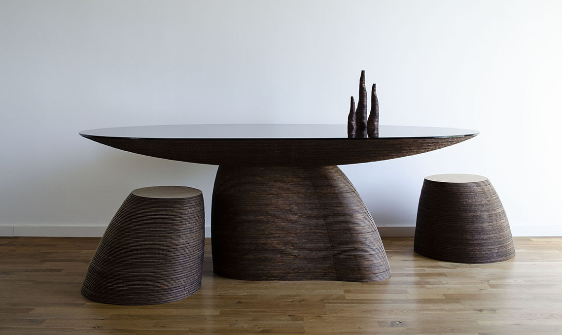Coll. STRATUM SAXUM, 2020 Tavolo da pranzo Bambù, vetro 200 x 110 x 74cm e STONE, 2020 sgabello Bambù 60 x 55 x 44cm