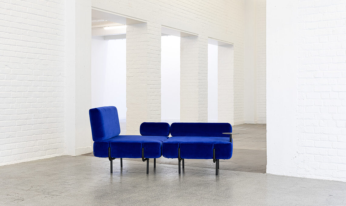 ADAPTABLE SOFA, 2019 Divano Acciaio galvanizzato nero, velluto di cotone blu Sedile L80 x L80 x H38,5cm, schienale L40/80 x W14 x H40cm, braccioli: L40/80 x W14 x H18cm, tavolini laterali : Ø20 x H10.3cm