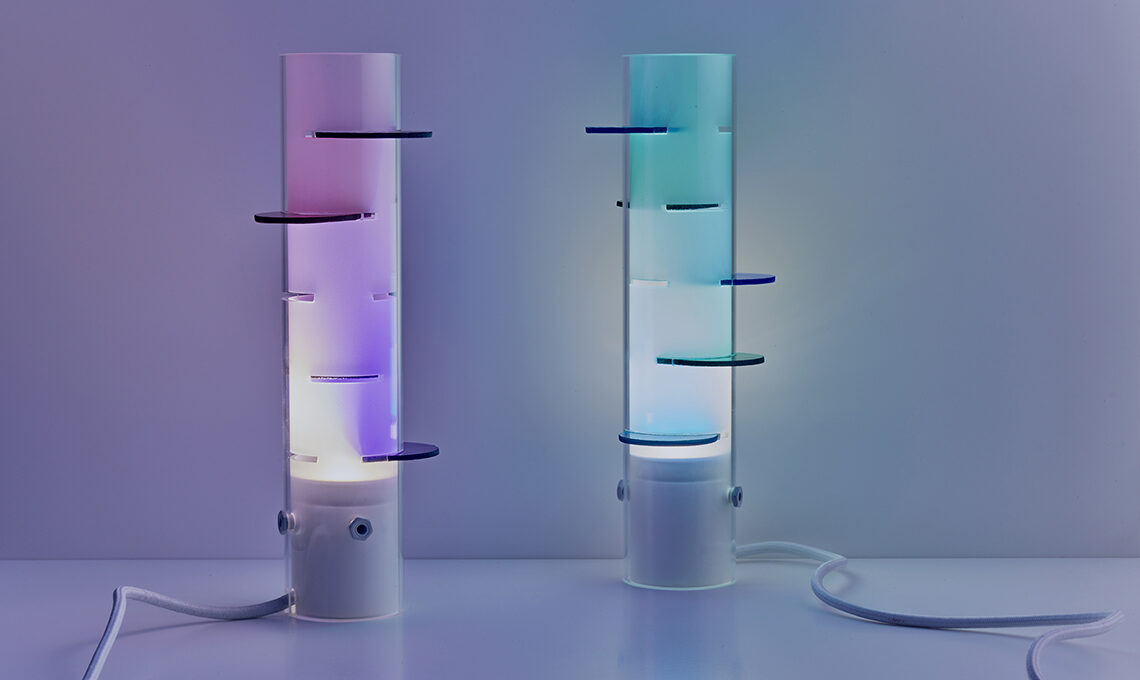 RAINBOW LIGHTING, 2020 Lampada Vetro o plexiglass sabbiato e colorato, alluminio laccato bianco Ø65 x H240mm, Ø105 x H701mm o Ø140 x H1097mm con lampadina LED