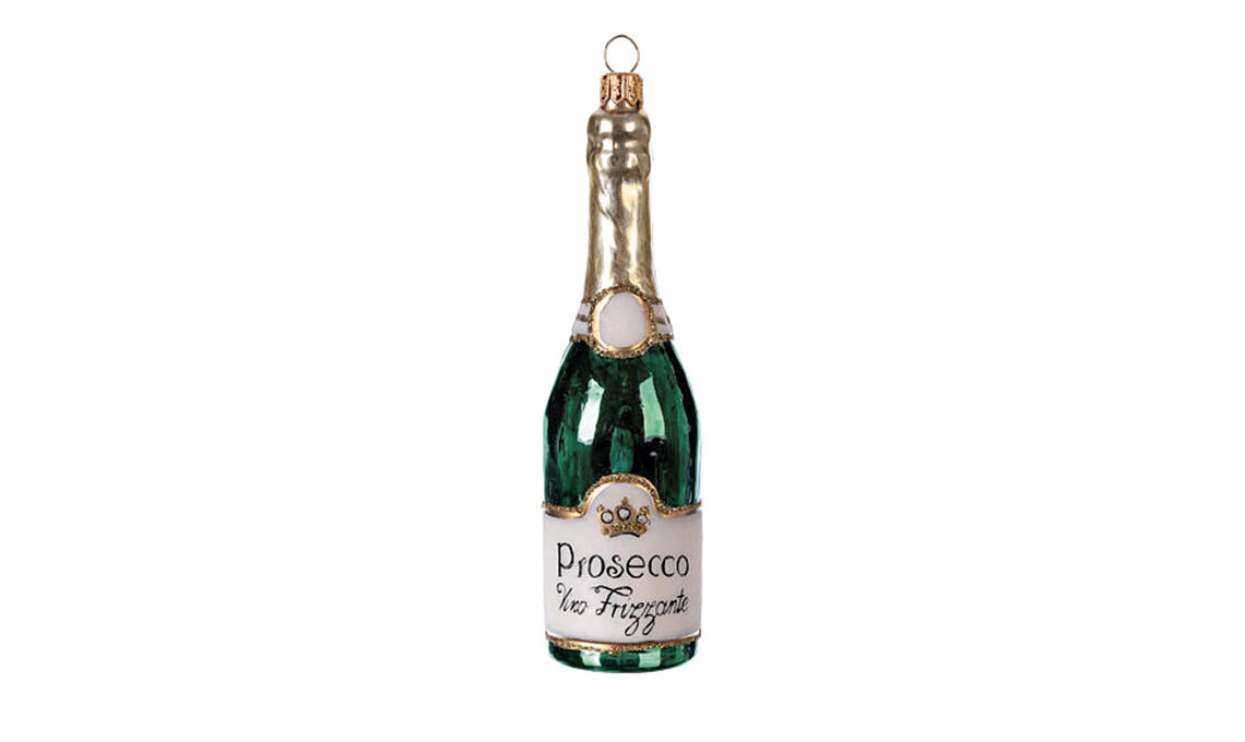 Dalla coll. Drinks, la bottiglia di Prosecco con finiture oro [Holy Art, cm 5,5h € 20,90].