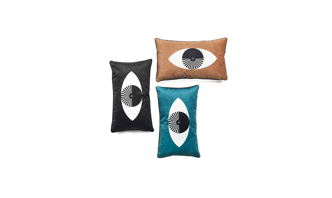 Un occhio stilizzato sul cuscino in velluto Polifemo [Mirabello Carrara, cm 55x30 €70].