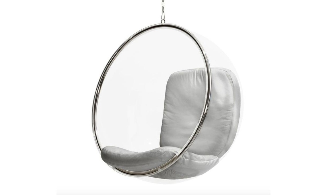 Bubble Chair, seduta-icona di Eero Arnio (1968), qui in argento [su » aarniooriginals € 4.544].