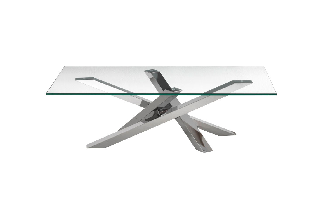 Un ‘gioco’ di gambe nel tavolo basso Shangai: acciaio inox e cristallo [Riflessi, cm 125x70x38h]