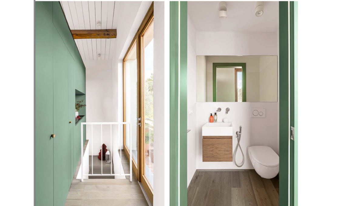 L’intervento ha ribaltato la distribuzione originaria: la zona giorno sale al piano superiore, dove un tempo si asciugava il fieno, mentre le camere trovano quiete al piano terra. Fulcro della casa è un grande volume verde in legno che nel living accoglie cucina, bagno e armadi, disegna i percorsi tra ingresso e salotto e costeggia con grazia la scala.