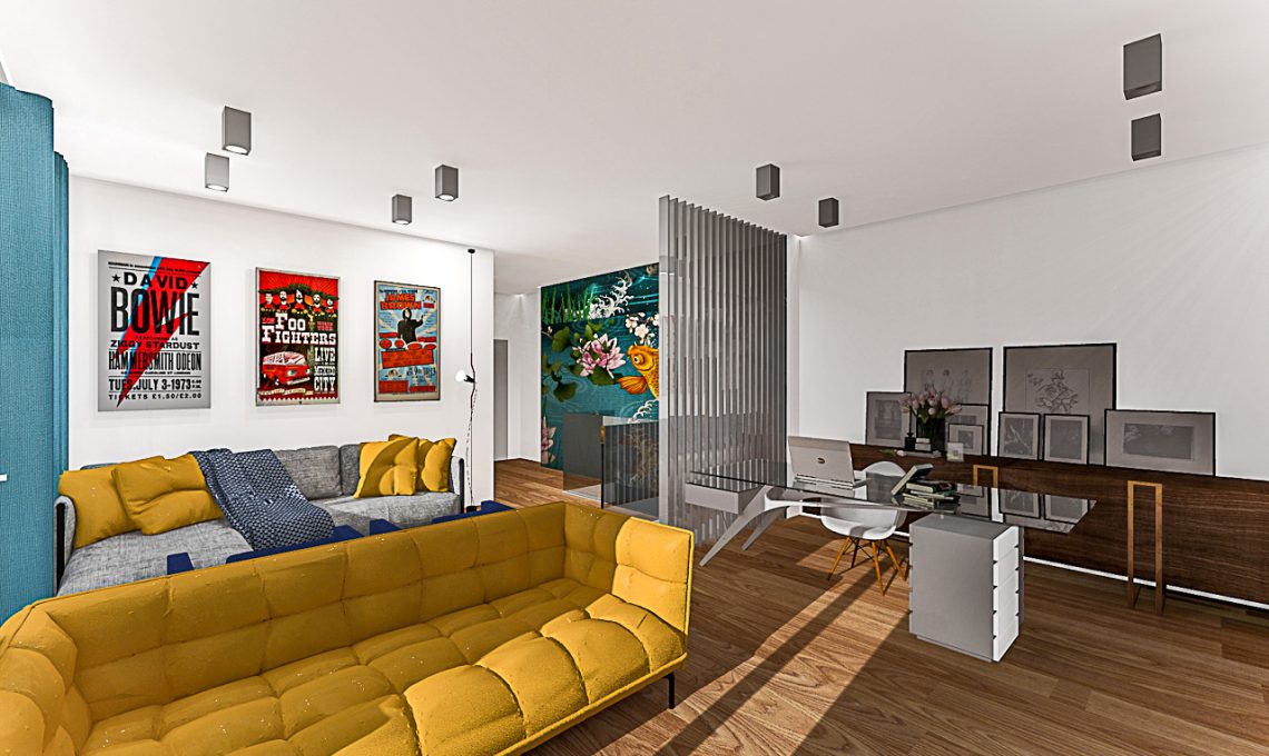 Una delle pareti del soggiorno è stata rivestita con una tappezzeria dal forte impatto (modello Koi Fish di LondonArt) che viene stampata su misura in base alle dimensioni