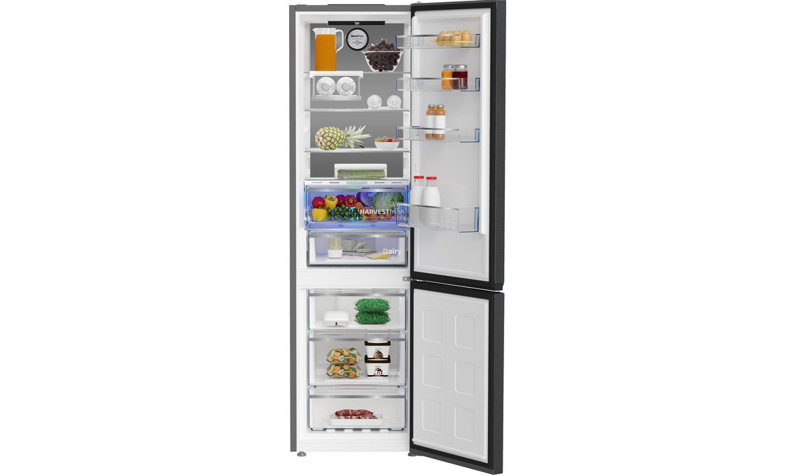 Il frigo combinato B5RCNE406HXB ha un cassetto verduriera con 3 luci che si attivano per simulare il ciclo giorno-notte, così da mantenere intatte a lungo le vitamine degli alimenti [Beko, cm 60x66x206h].