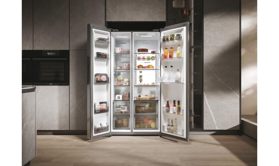 Il frigorifero side by side in classe A e da 616 litri SBS 90 Serie 7 mantiene tutti gli alimenti freschi grazie a zone specializzate e al cassetto speciale Humidity Zone [Haier, cm 90,5x72,6x177,5h].