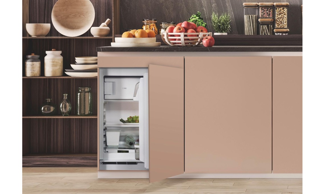 Il frigo sottopiano da 126 litri HA 859991674930 FF è dotato di 2 cassetti, balconcino portabottiglie, ripiani e reparto congelatore da 18 litri [Hotpoint Ariston, cm 59,7x54,5x81,9h].