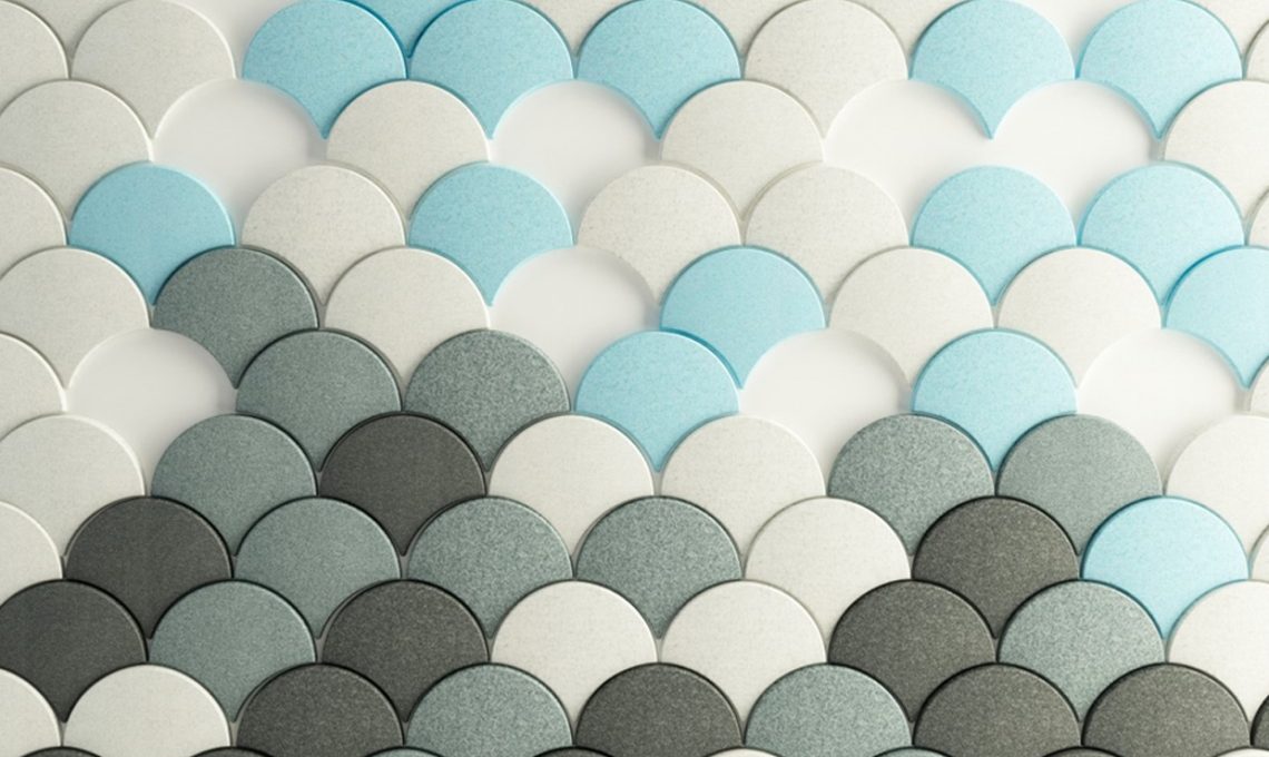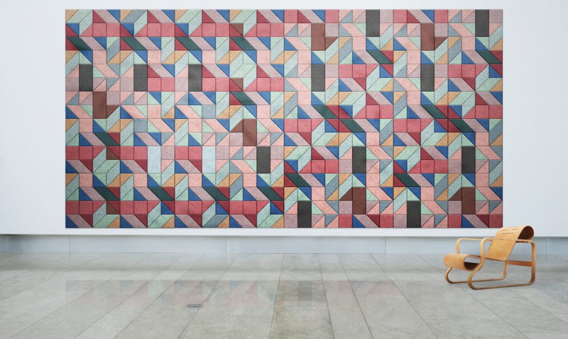 Una soluzione fonoassorbente decisamente molto decorativa: un planner sul sito permette di creare la propria combinazione, scegliendo la grandezza del muro e i colori dei singoli elementi. [Ginkgo di Bla Station - blastation.com]