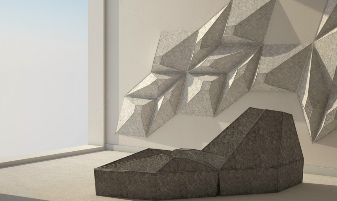 Geometrie ispirate alla natura per questi elementi che si possono mettere a terra, per creare posti a sedere, o sul muro, in modo da sfruttare le ottime capacità isolanti della lana. [Les Angles di Smarin - smarin.net]
