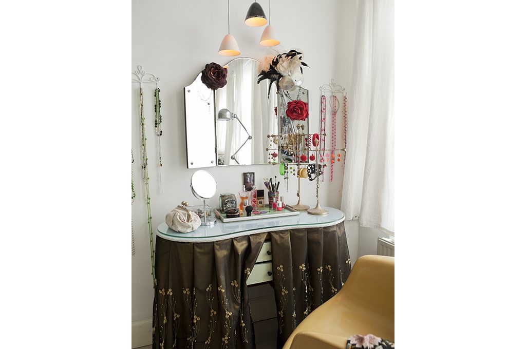 Angolo toilette dal fascino rétro con il tessuto di seta cangiante agganciato al mobiletto che cela i cassetti.