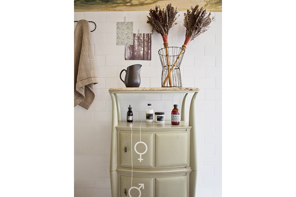 Mobiletto di recupero riverniciato e decorato con i simboli femminile e maschile: a ognuno il suo cassetto!