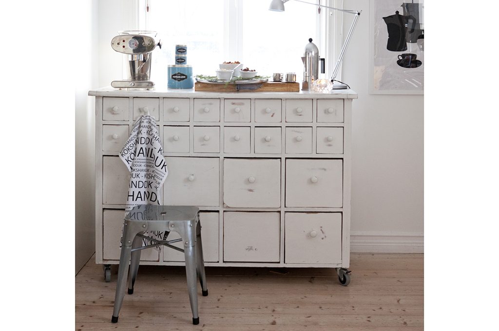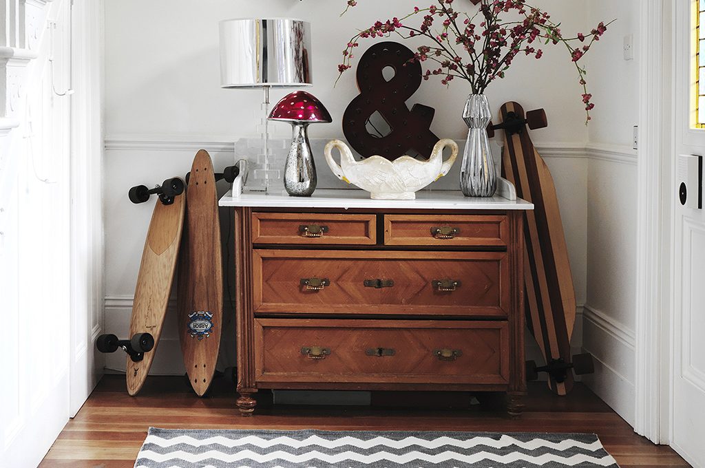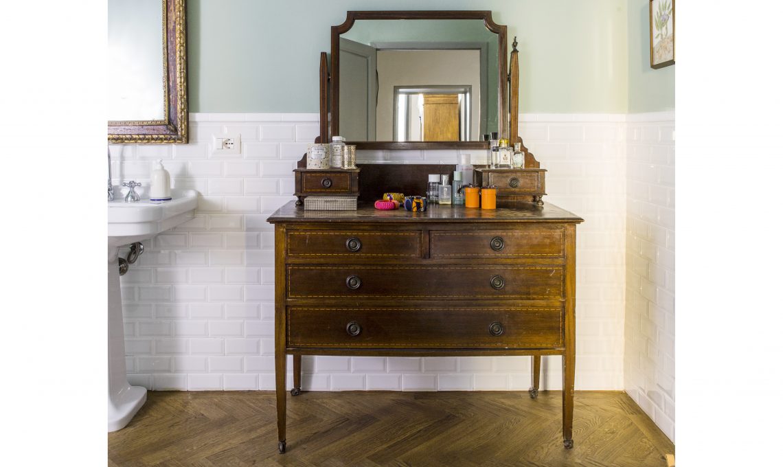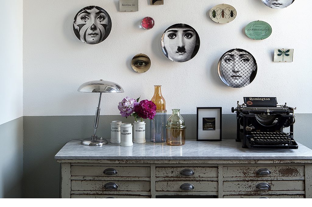 Antico cassettone allestito con stile giocando con arredi vintage e contemporanei.