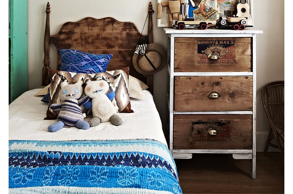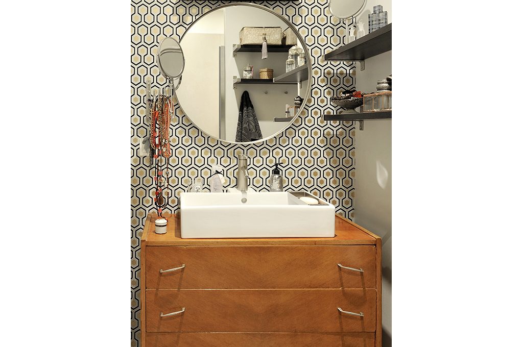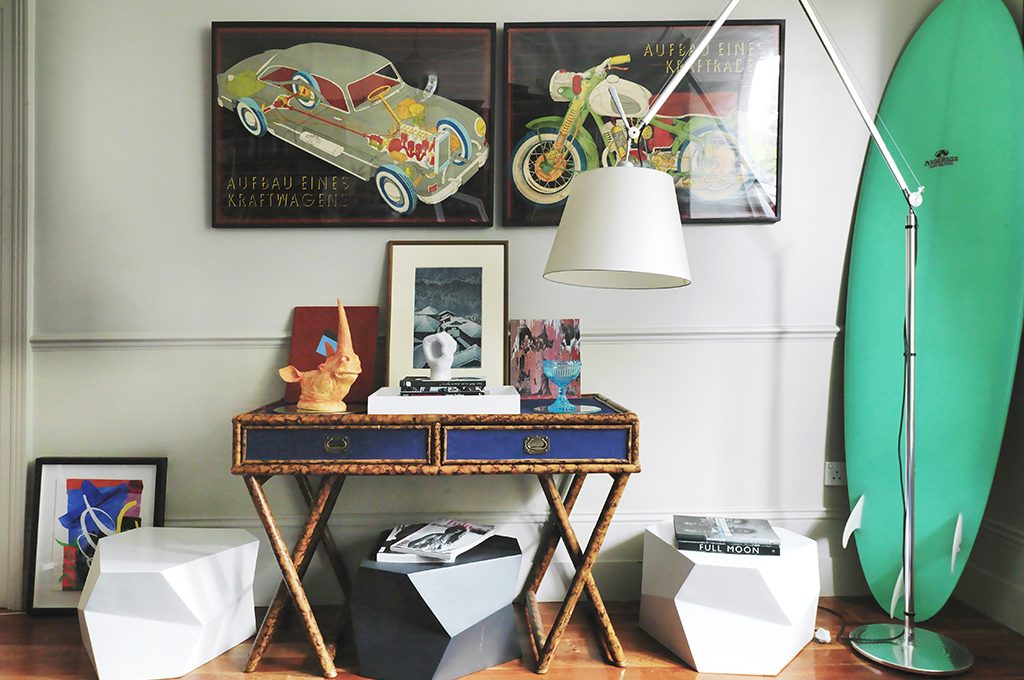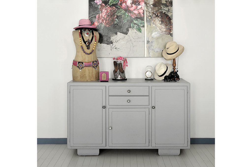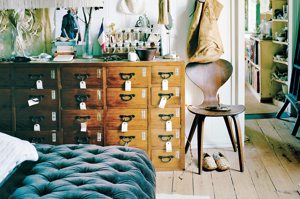 Antico cassettone allestito con stile giocando con arredi vintage e contemporanei.