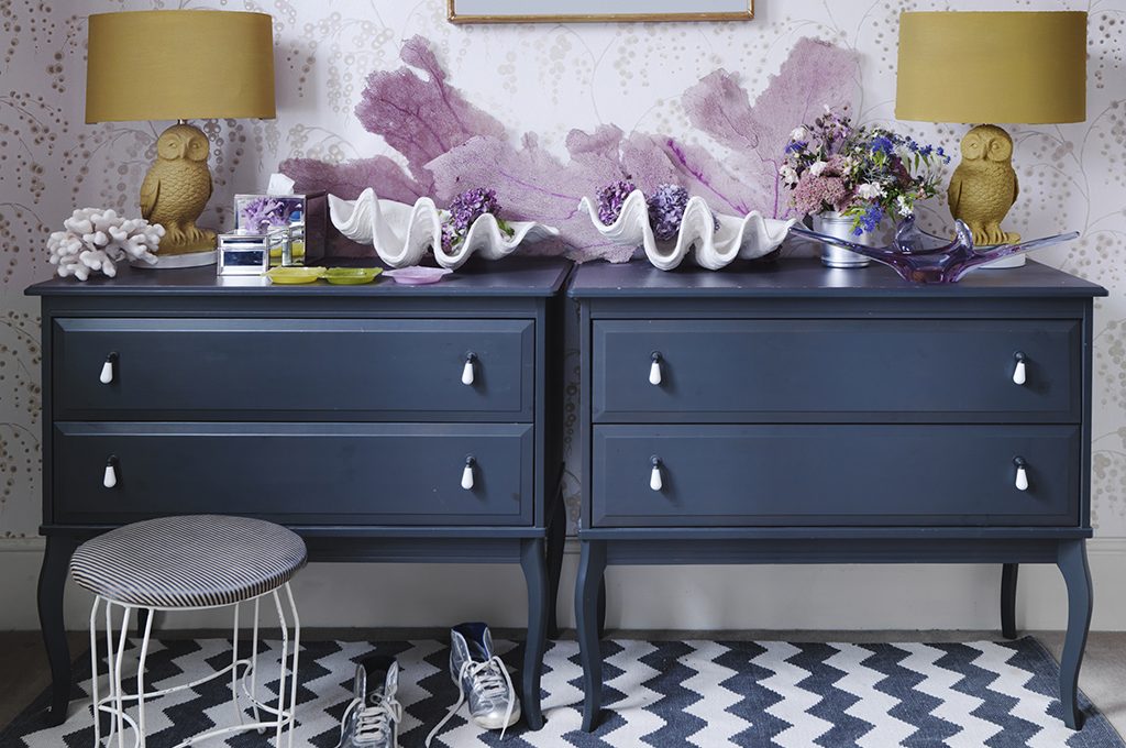 Cassettiere gemelle rétro laccate in blu polvere con pomelli in ceramica a contrasto.