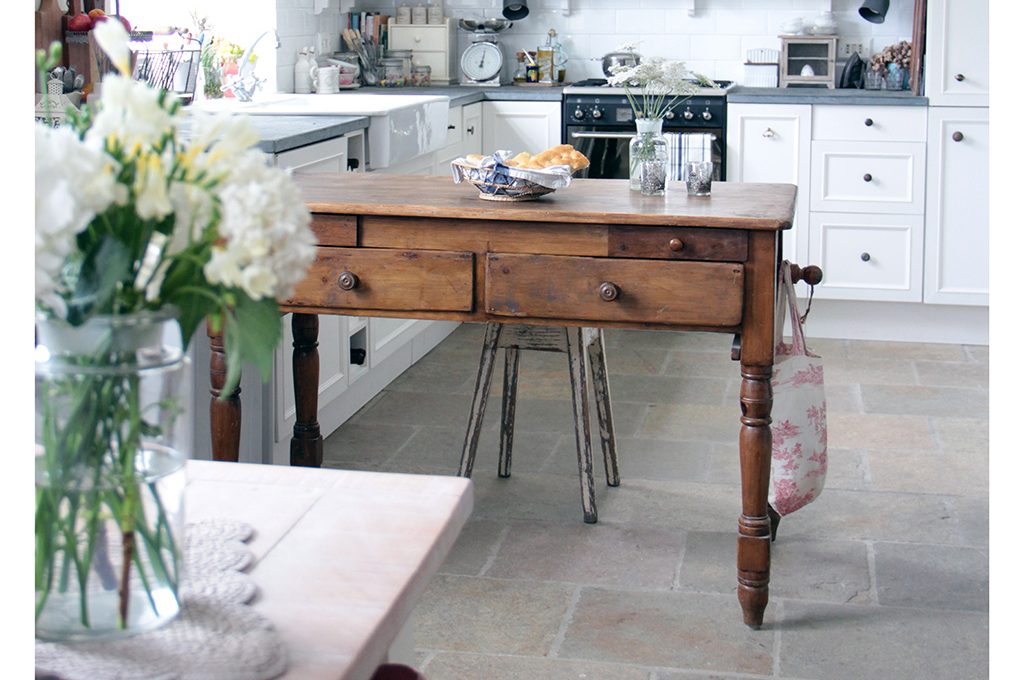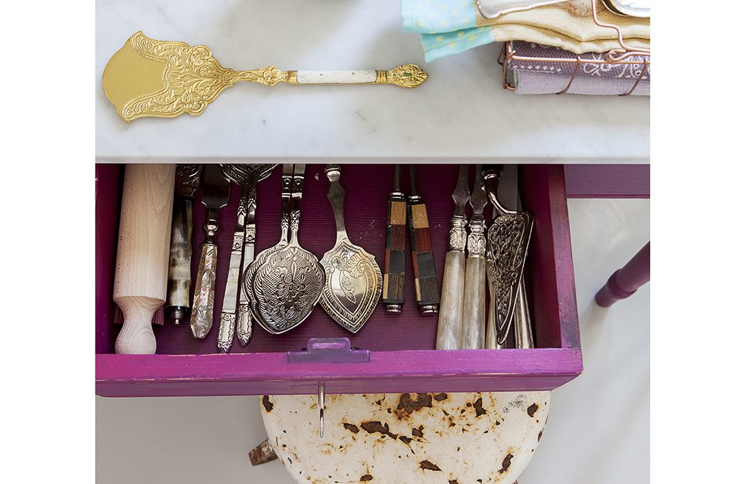 Il cassetto sottopiano del tavolo da servizio in cucina è stato dipinto di un viola acceso per dare un tocco moderno.