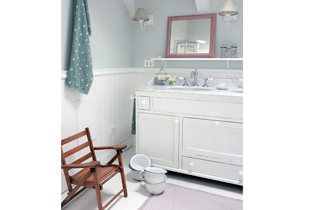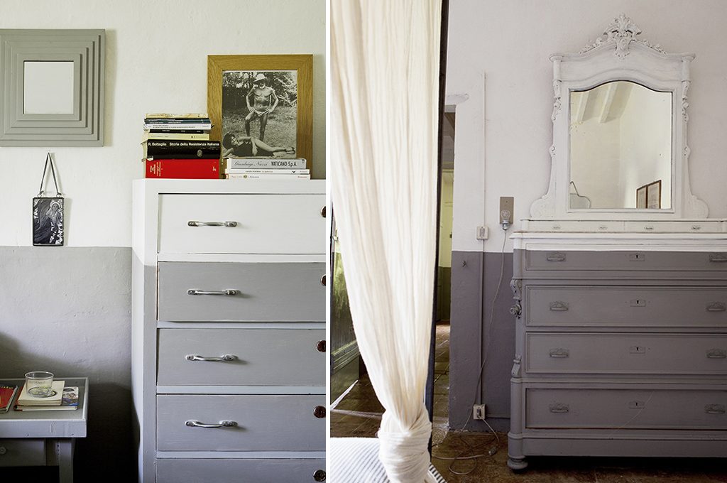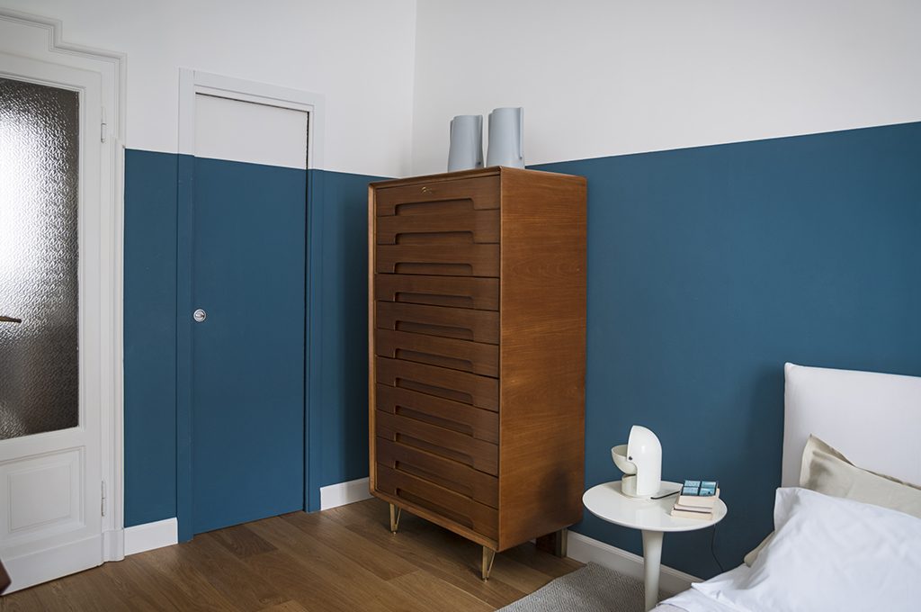 L'effetto boiserie realizzato con il colore grigio sovrasta anche i mobili rétro creando un effetto 'bi-color'.