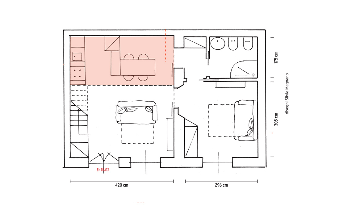 I due ambienti avevano altezze diverse: uno è stato soppalcato e, sopra, si possono mettere due futon per i ragazzi. Sotto è stata organizzata la zona pranzo con piccola cucina. Il resto del living è a doppia altezza con divano letto. L’altra stanza, dalla quale con un disimpegno si accede al bagno con doccia, ha un altro divano letto.