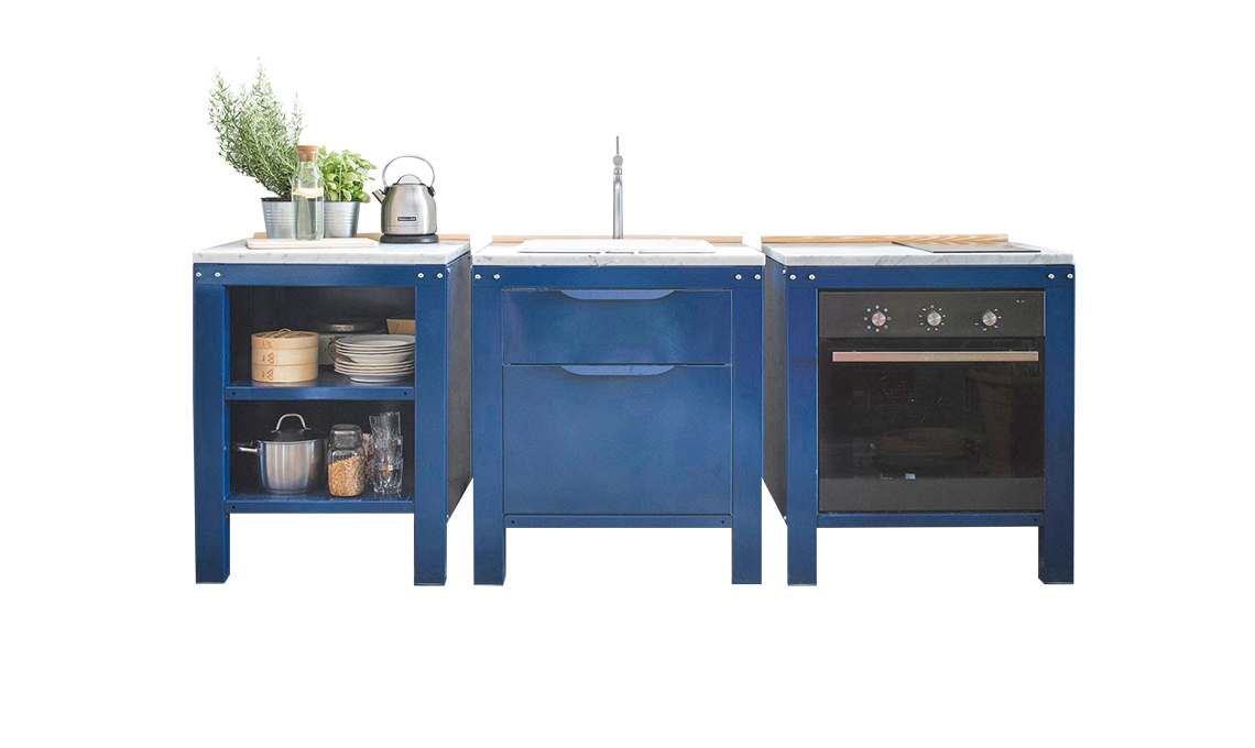 - La mini cucina lunga 2 metri è organizzata con basi e pensili che arrivano a filo del del soppalco, così come la colonna da cui parte la penisola.