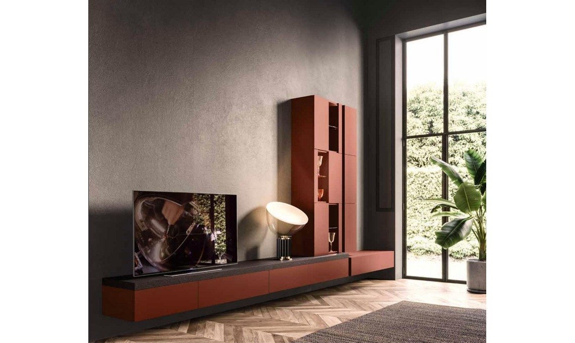 Mobile Day Collection, composto da basi sospese laccato opaco Amaranto, panca Fashion wood rovere Fossile e pensili Show laccato opaco Amaranto [Alf DaFrè,