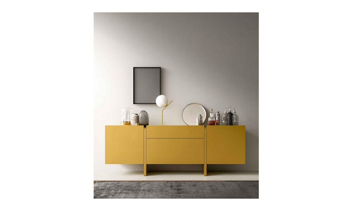 Madia Recta, qui nella finitura Laccato lucido curcuma e interni in nobilitato pelle crema [Alf DaFrè, cm 186,8x55x78,2h].