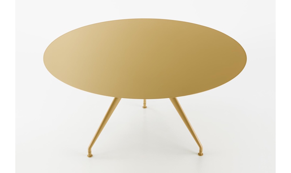 Tavolo Manta con struttura in alluminio e top in vetro, qui in finitura giallo kashmir [Rimadesio, ø cm 140x74h].